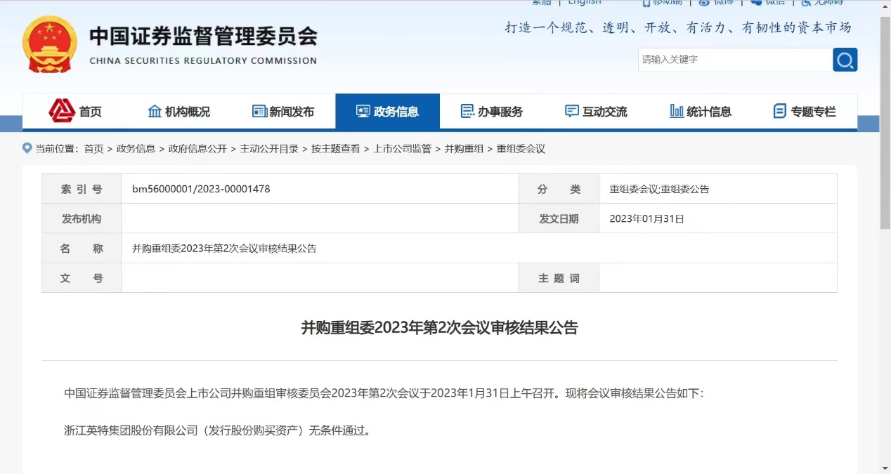 英特集團重大資產重組項目經證監會并購重組委審核獲無條件通過