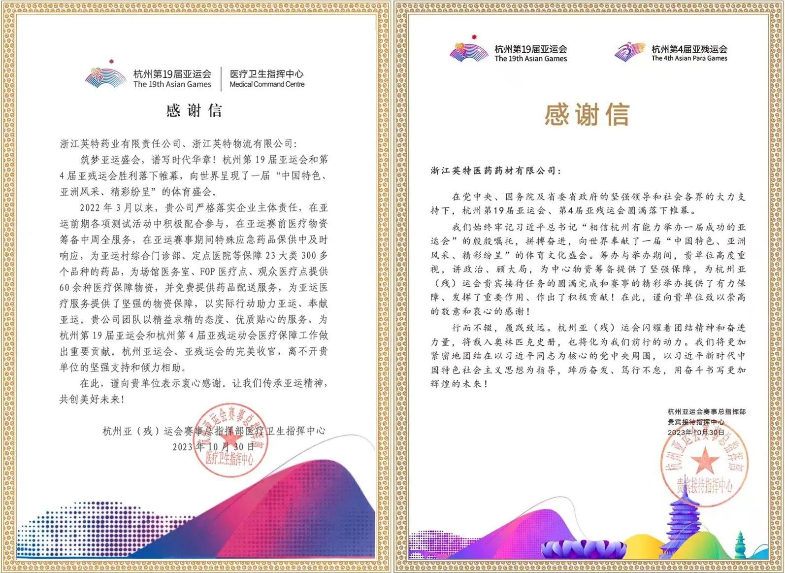 日前,杭州第19屆亞運會組委會、杭州第4屆殘運會組委會向英特集團發來感謝信,對英特為成功舉辦杭州亞運會、亞殘運會做出的積極貢獻表示衷心的感謝。同時,英特藥業、英特物流和英特藥材等公司也獲得杭州亞(殘)運會賽事總指揮部醫療衛生指揮中心、貴賓接待指揮中心的感謝與肯定。