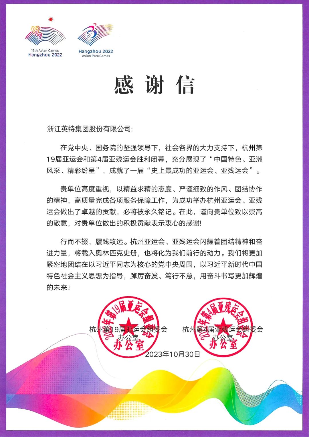 英特集團收到杭州亞組委和亞殘組委感謝信